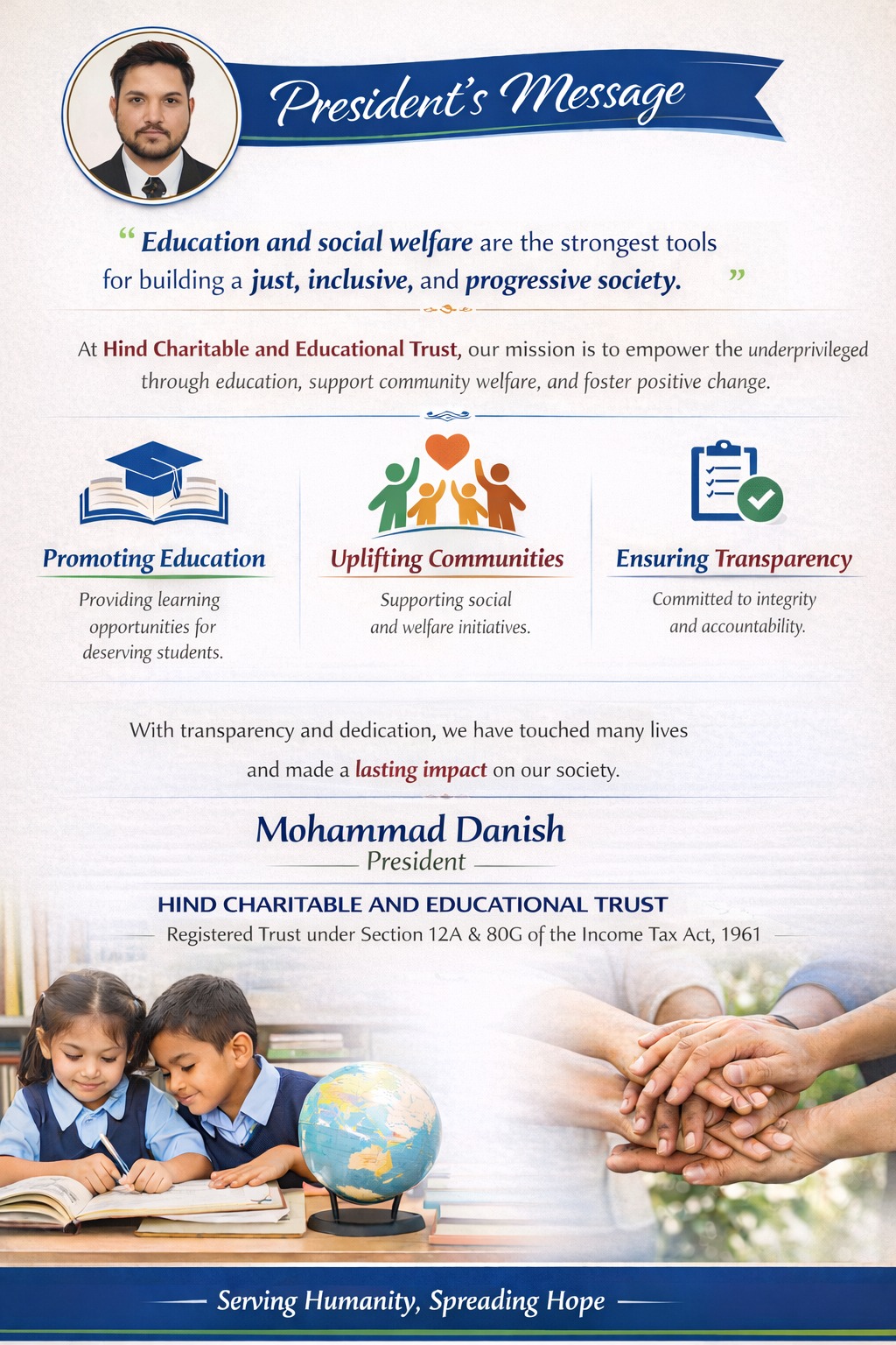 Mohammad Danish, President of HIND CHARITABLE AND EDUCATIONAL TRUST, take this opportunity to share the vision, motives, and achievements of our Trust, which was established with the noble objective of serving society through education, social welfare, and humanitarian activities.
